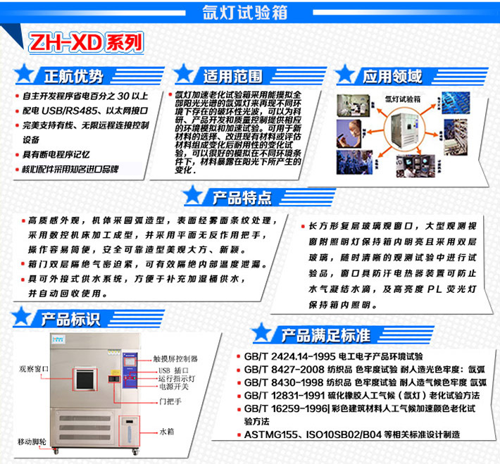 氙燈老化箱采用能模擬全陽光光譜的氙弧燈來再現不同環境下存在的破壞性光波,可以為科研、產品開發和質量控制提供相應的環境模擬和加速試驗。